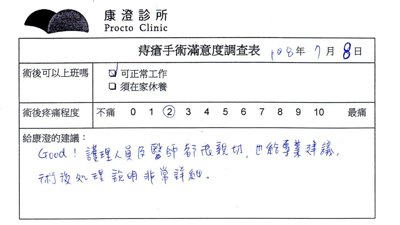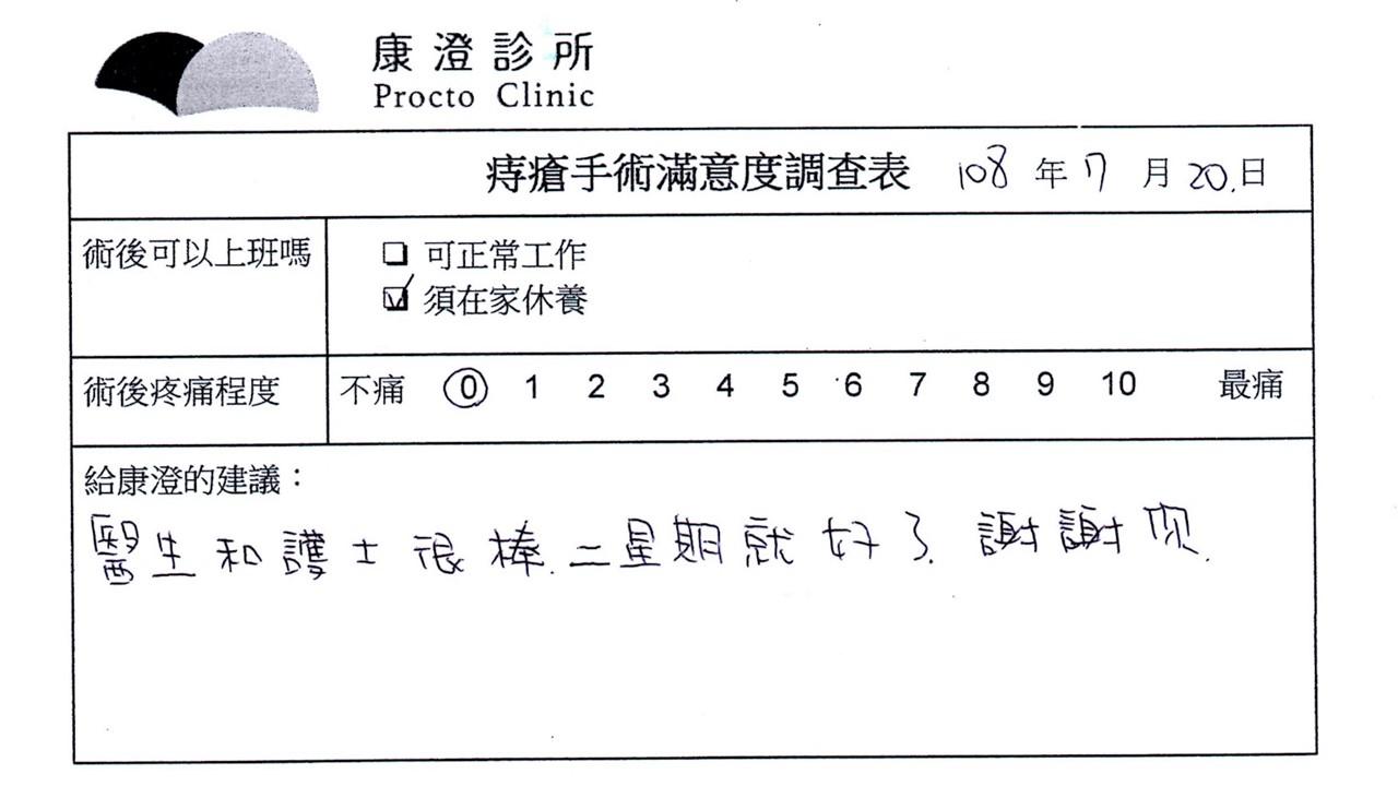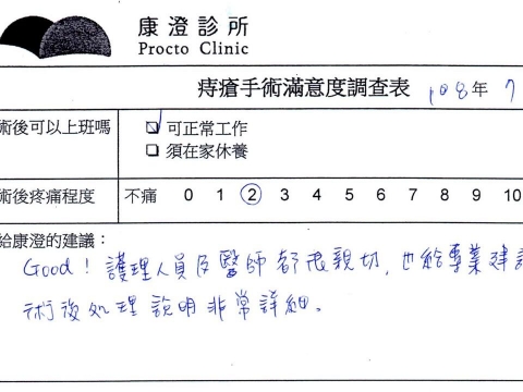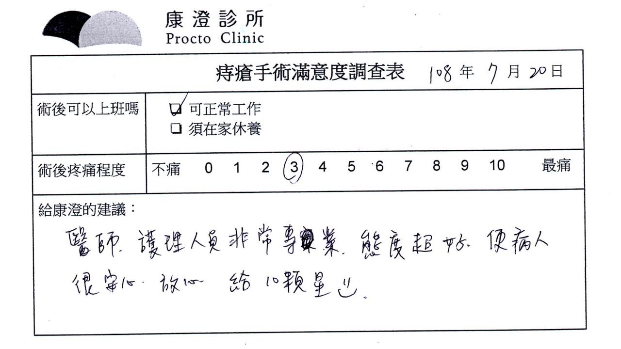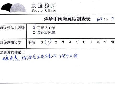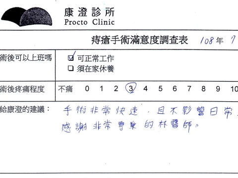「困擾了20多年的三期內痔,終於在幾天內就解決了,原以為會很疼痛的手術及復原過程,結果真是神奇 啊!不會痛呢!長效針應該是有用的,前幾天主要是腫脹,感謝林醫師,以及術後時時電話關心的小護士們,很棒!」