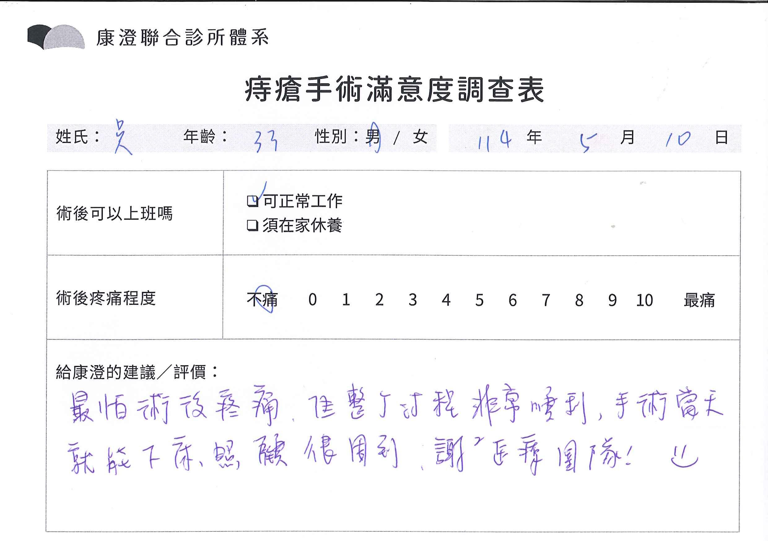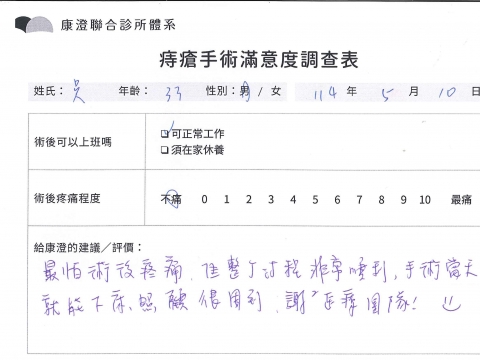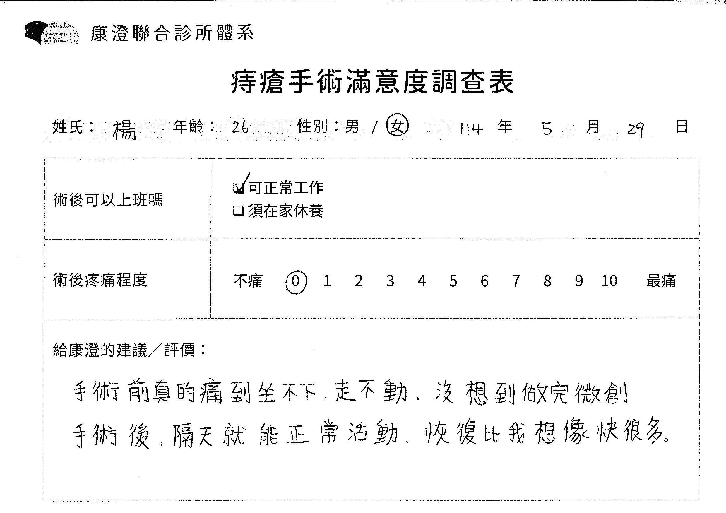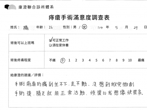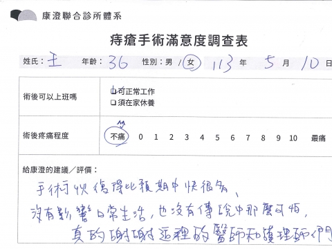 「困擾了20多年的三期內痔,終於在幾天內就解決了,原以為會很疼痛的手術及復原過程,結果真是神奇 啊!不會痛呢!長效針應該是有用的,前幾天主要是腫脹,感謝林醫師,以及術後時時電話關心的小護士們,很棒!」
