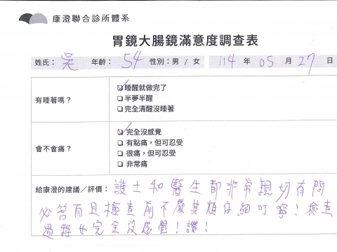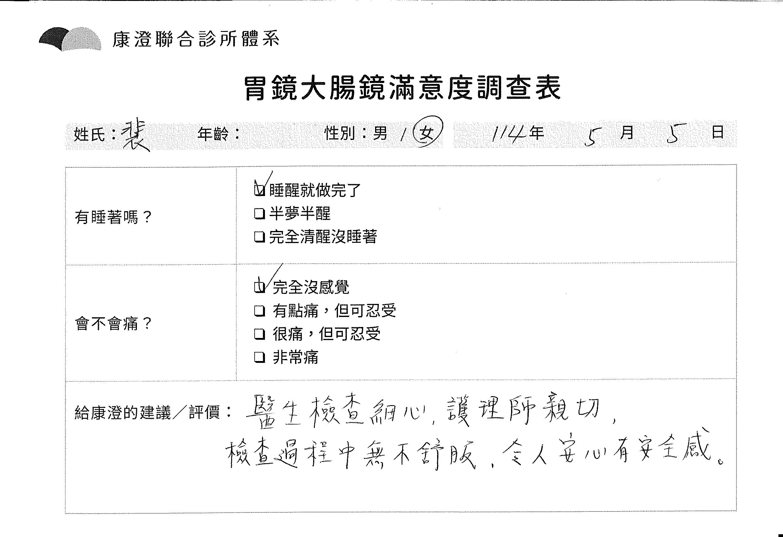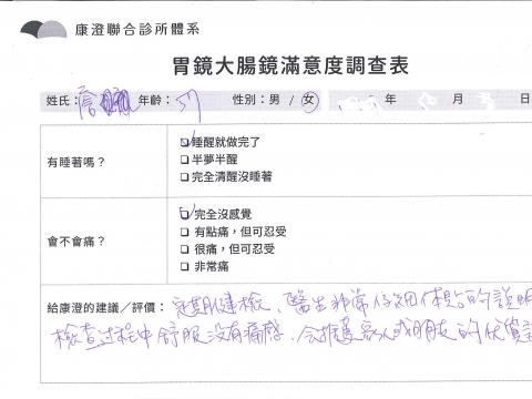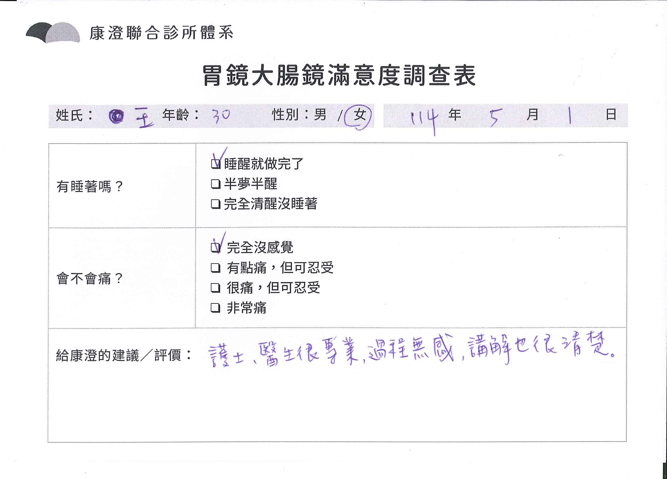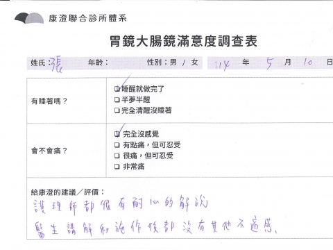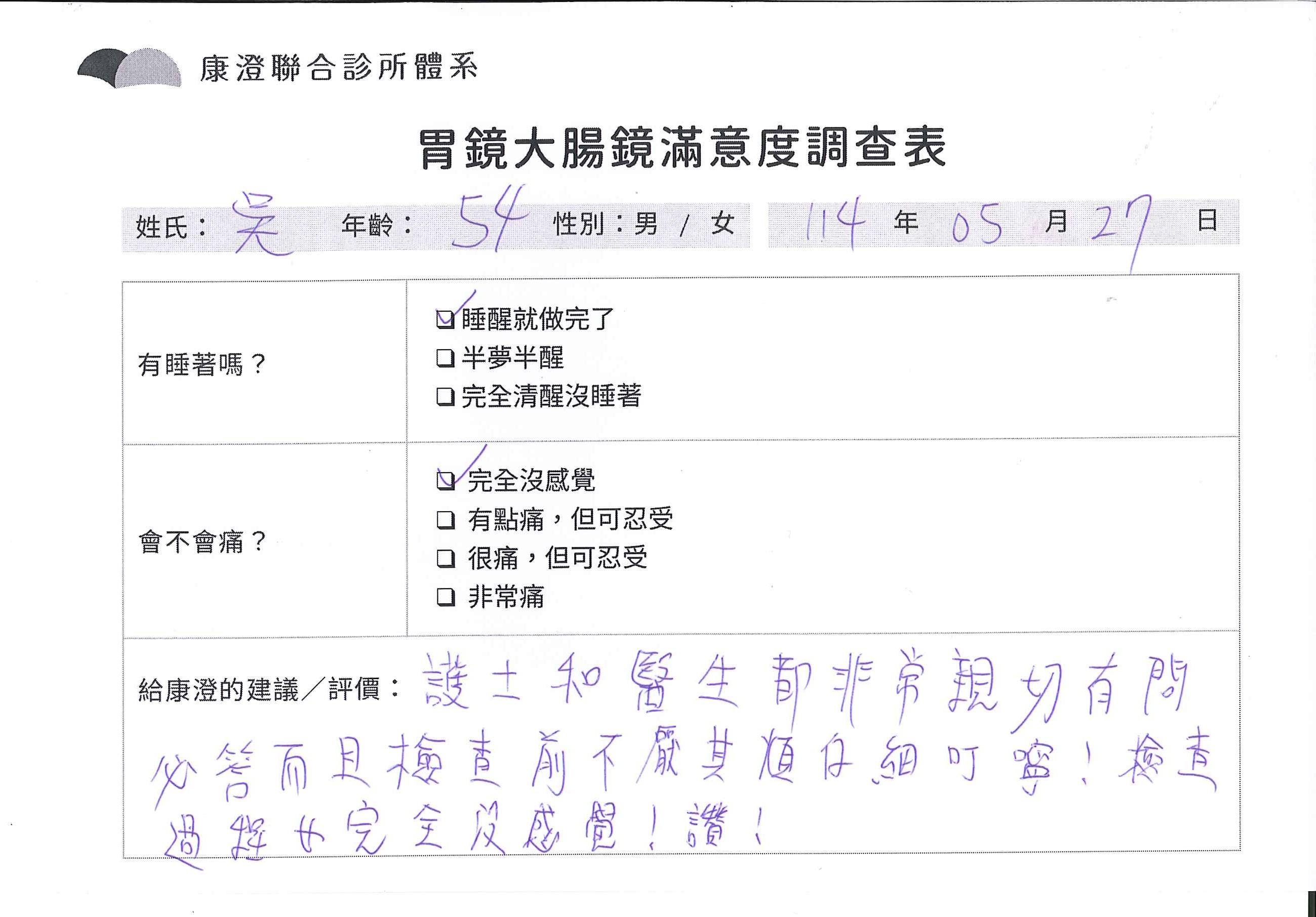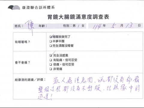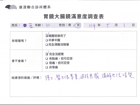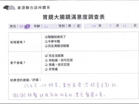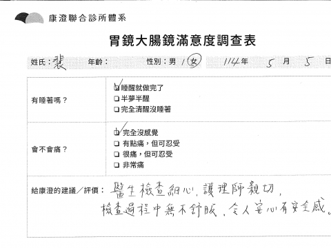 「定期穩定在櫃診所健檢,腸胃鏡的檢查醫療團隊及護理人員後續衛教的處理不輸醫院等級ㆍ專業丶舒適丶 安心,整個療程無痛,護理人員親切可降低檢查的緊張感,非常感謝!」