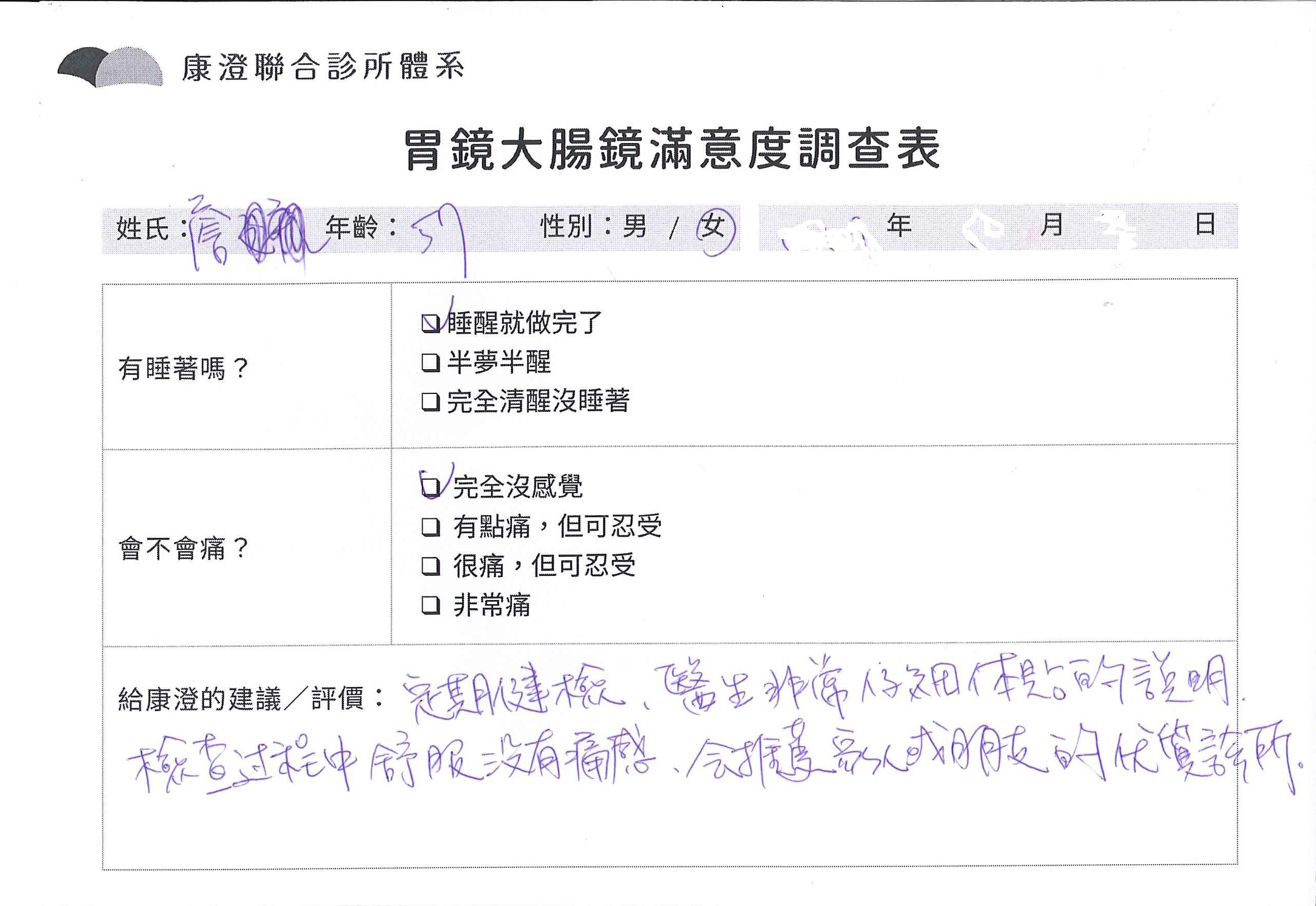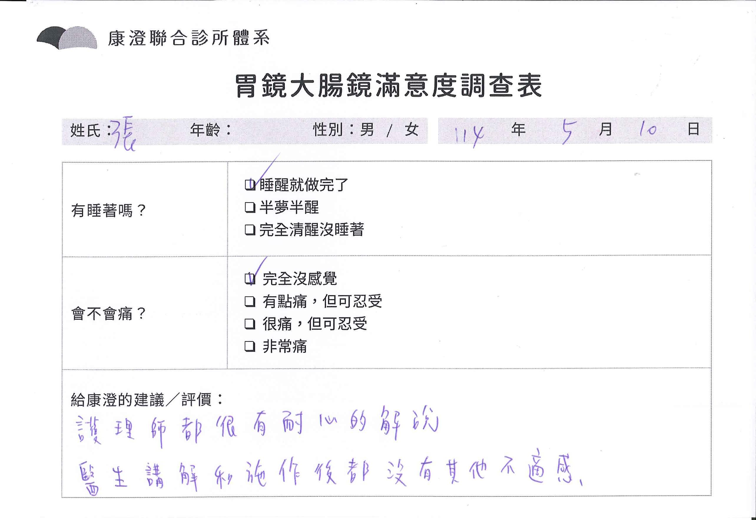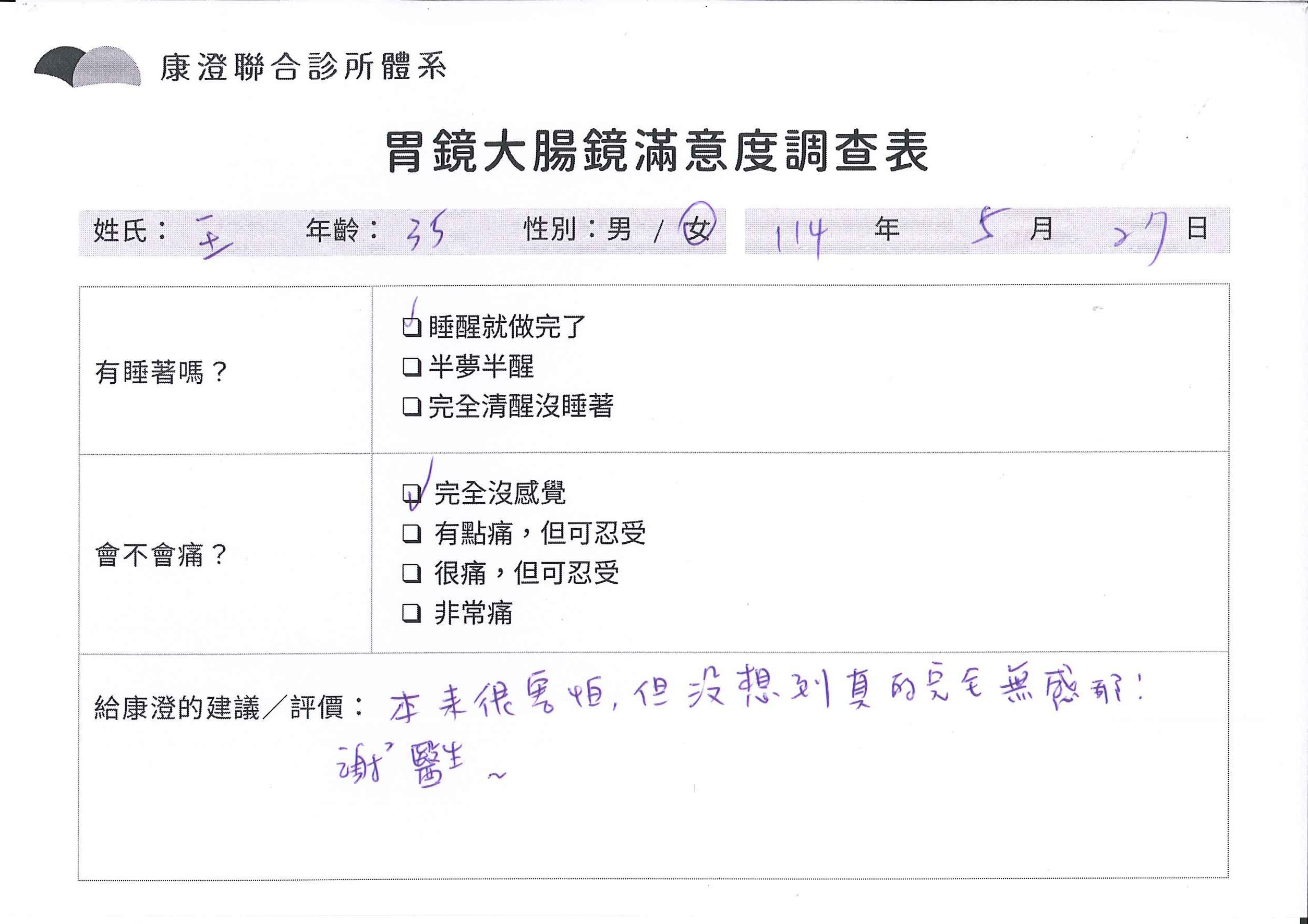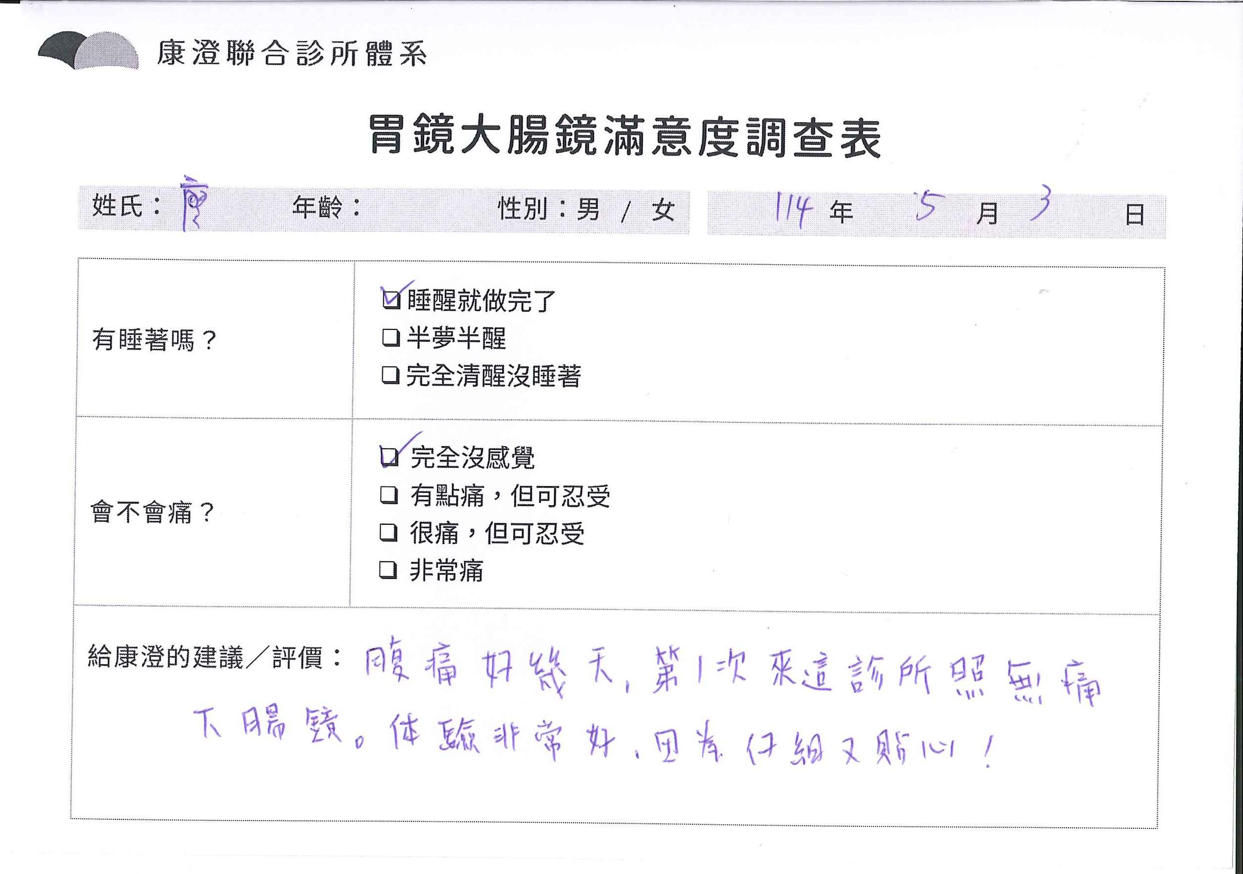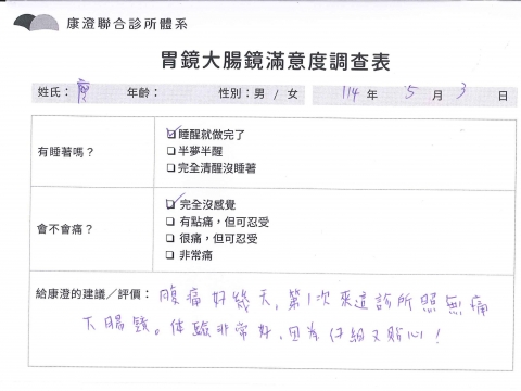 「定期穩定在櫃診所健檢,腸胃鏡的檢查醫療團隊及護理人員後續衛教的處理不輸醫院等級ㆍ專業丶舒適丶 安心,整個療程無痛,護理人員親切可降低檢查的緊張感,非常感謝!」